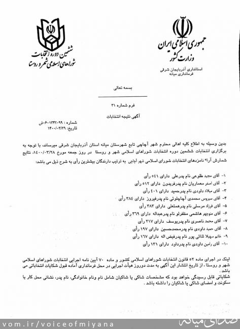 همانطور که دیروز صبح در صدای میانه ، نتایج انتخابات به صورت غیر رسمی اعلام شده بود ،نتایج رسمی ششمین دوره شورای شهر میانه ،ترکمانچای ،ترک ،آقکند نیز به صورت زیر می باشد: