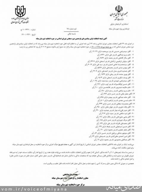 بالاخره فرمانداری میانه آمار رسمی انتخابات میان دوره ای مجلس را انتشار داد.