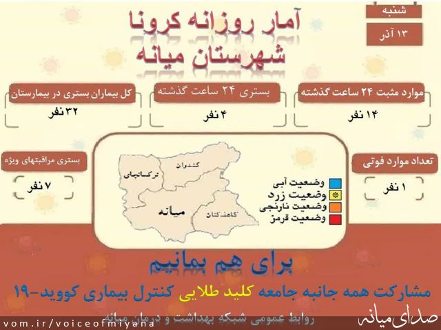 کد خبر: ۱۱۲۹۷۶ گوناگون ۵۳۲ بازدید ۰ دیدگاه (۰ تایید شده) آخرین آمار کرونا در شهرستان میانه (۱۳ آذر) صدای میانه ۱۴۰۰/۹/۱۳ ۱۱:۰۹