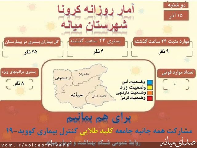 کد خبر: ۱۱۳۰۸۶ گوناگون ۴۳۱ بازدید ۰ دیدگاه (۰ تایید شده) جدیدترین آمار کرونا در شهرستان میانه (۱۵ آذر) صدای میانه ۱۴۰۰/۹/۱۵ ۱۳:۴۰