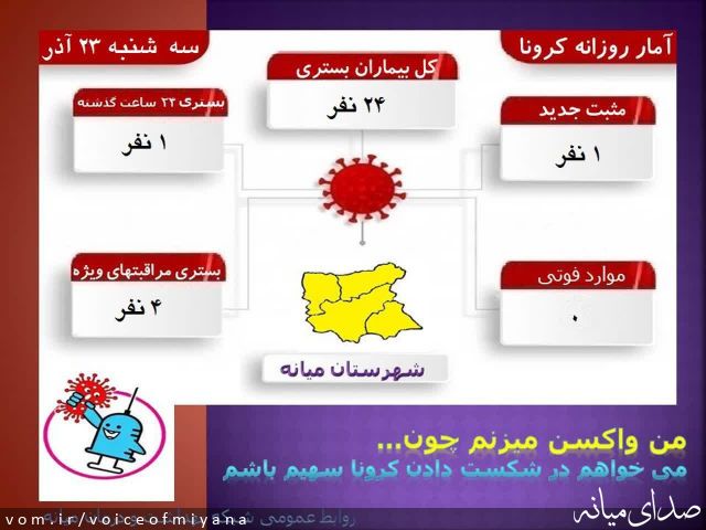 کد خبر: ۱۱۳۴۷۰ گوناگون ۴۴۹ بازدید ۰ دیدگاه (۰ تایید شده) جدیدترین آمار کرونا در شهرستان میانه صدای میانه ۱۴۰۰/۹/۲۳ ۱۰:۳۵