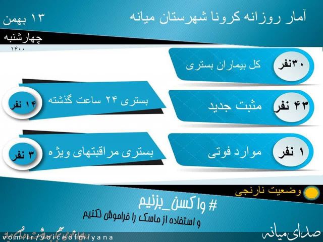 جدیدترین آمار کرونای شهرستان میانه با وضعیت نارنجی
