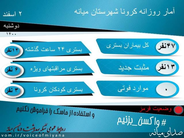 کد خبر: ۱۱۵۸۰۹ گوناگون ۴۶۴ بازدید ۰ دیدگاه (۰ تایید شده) جدیدترین آمار کرونا در شهرستان میانه صدای میانه ۱۴۰۰/۱۲/۲ ۲۰:۲۲