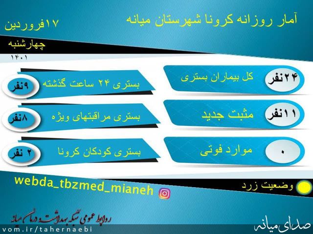 کد خبر: ۱۱۶۸۸۹ گوناگون ۴۴۷ بازدید ۰ دیدگاه (۰ تایید شده) جدیدترین آمار کرونا در شهرستان میانه صدای میانه ۱۴۰۱/۱/۱۷ ۱۴:۵۲