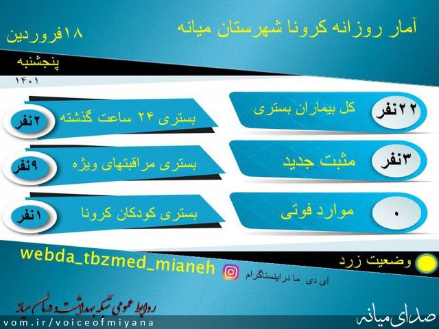 کد خبر: ۱۱۶۹۰۹ گوناگون ۴۰۰ بازدید ۰ دیدگاه (۰ تایید شده) جدیدترین آمار کرونا در شهرستان میانه صدای میانه ۱۴۰۱/۱/۱۸ ۱۳:۱۴