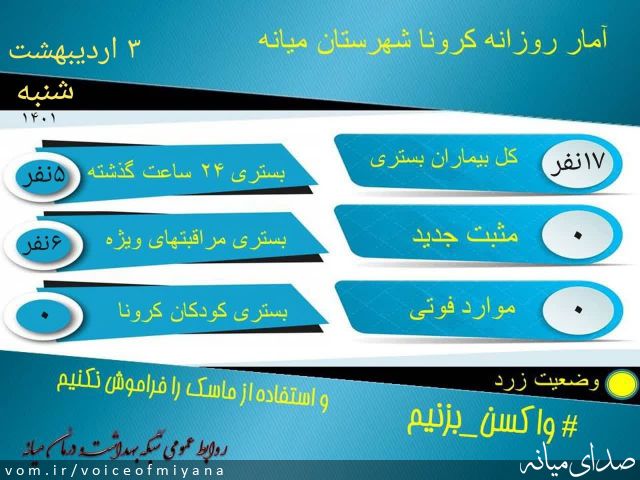 کد خبر: ۱۱۷۳۳۷ گوناگون ۴۴۲ بازدید ۰ دیدگاه (۰ تایید شده) جدیدترین آمار کرونا در شهرستان میانه (وضعیت زرد) صدای میانه ۱۴۰۱/۲/۳ ۱۱:۵۹