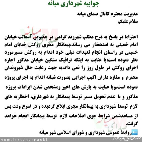 پیرو پیام منتشر شده در صدای میانه پیرامون کیفیت و وضعیت آسفالت خیابان امام #میانه ،شهرداری در این زمینه جوابیه ای صادر کرد که متن پیام و جوابیه در اسلایدهای این پست آمده است.